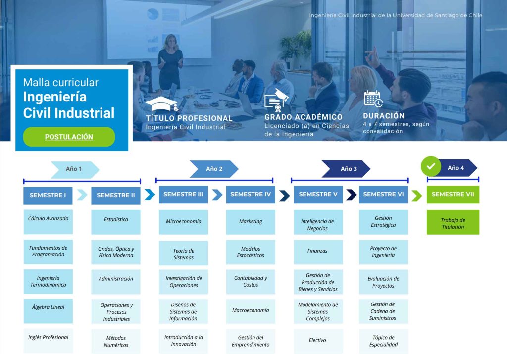 La carrera de Ingeniería Civil Industrial en la Universidad de Santiago de Chile (USACH) está diseñada para formar profesionales altamente capacitados en la resolución de problemas complejos, mediante una sólida formación en ciencias básicas, ingeniería y gestión. A lo largo de 11 semestres, los estudiantes adquieren conocimientos en áreas fundamentales de las ciencias exactas, así como en materias relacionadas con la administración, economía, y las ciencias de la ingeniería, con un enfoque hacia la sostenibilidad, la innovación y la toma de decisiones estratégicas.